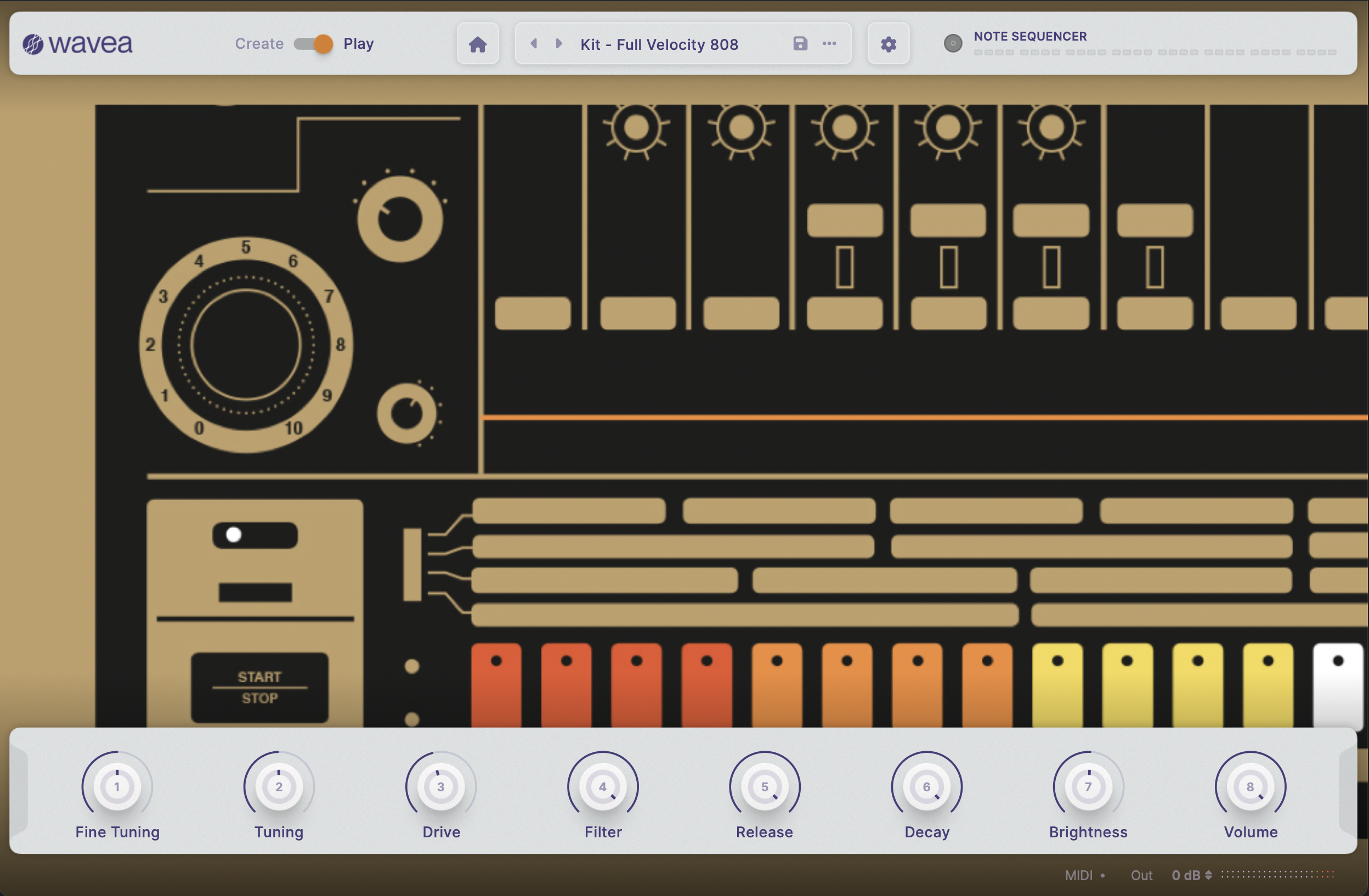 - Every available pitch, timbre and tone of every TR-808 instrument.